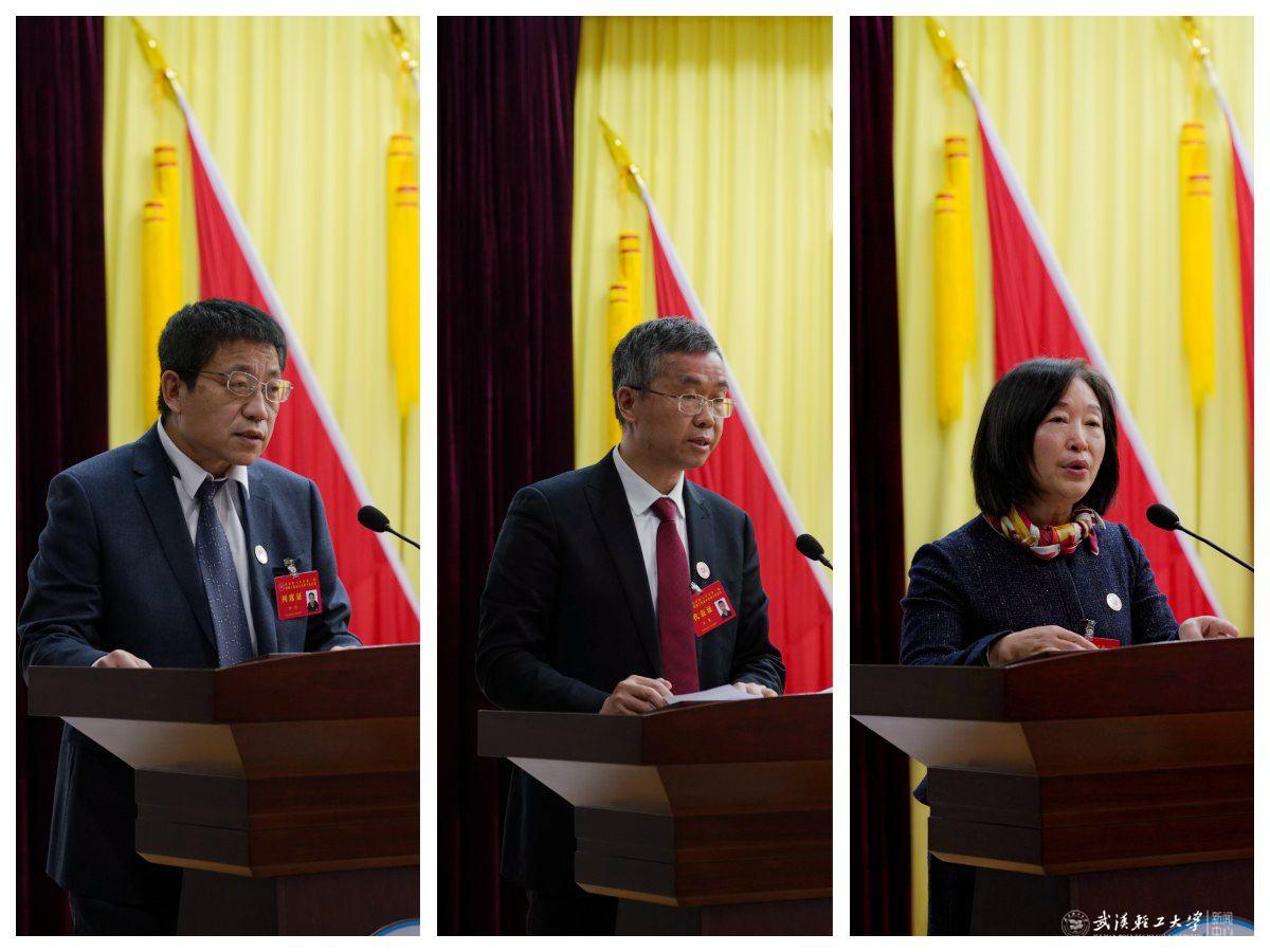 从左往右依次为:学校财务处处长李俊、教代会提案工作委员会主任委员乔勇、校工会常务副主席滕红华作相关工作报告