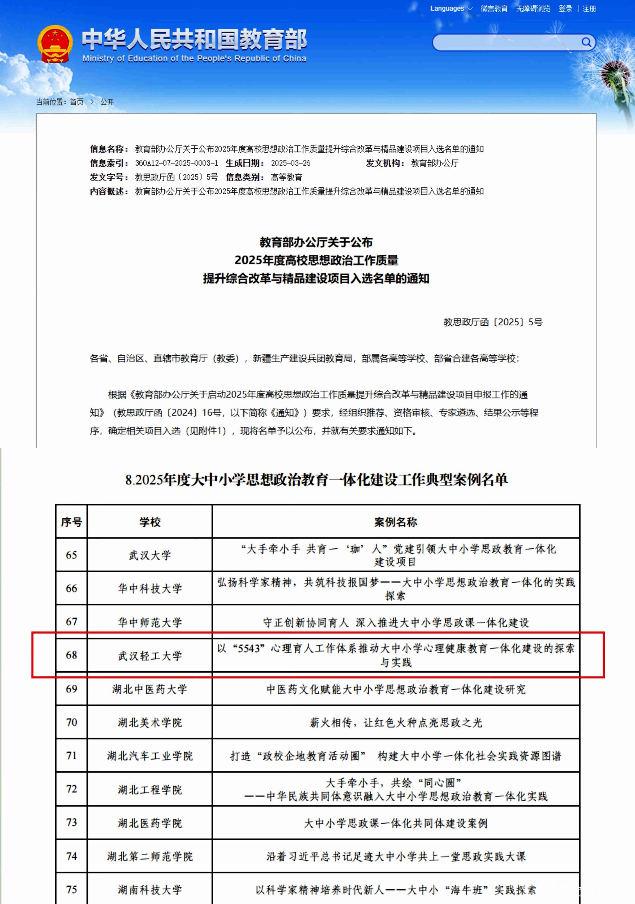 本网讯 近日,教育部办公厅公布了2025年度高校思想政治工作质量提升综合改革与精品建设项目入选名单。我校学工部(处)申报的《以“5543”心理育人工作体系推动大中小学心理健康教育一体化建设的探索与实践》荣获2025年度大中小学思想政治教育一体化建设工作典型案例。