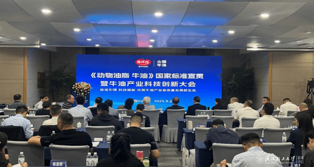 本网讯 9月27日,国家标准《动物油脂 牛油》(GB/T 46004-2025)宣贯暨牛油产业科技创新大会在四川广汉召开。大会围绕“宣贯国家标准、引领科技创新、促进供需对接、树立行业标杆”主旨展开,旨在推动牛油产业标准化、科技化发展。由我校二级教授、全国粮油标准化技术委员会油料及油脂分技术委员会主任委员何东平,校党委原副书记刘丰林教授领衔的“轻工智囊团”,依托学校在油脂科学领域的深厚积累,通过“教师主持、专家发声、博士献智、校友践行、学会支撑”的全方位参与模式,为大会注入“轻工智慧”。