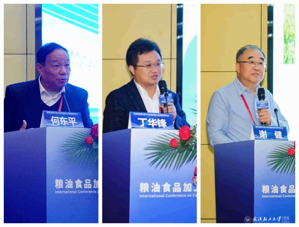 从左到右依次为:中国粮油学会油脂分会会长何东平致辞;中国地质大学丁华锋教授,原国粮武汉科研设计院总工程师、高级工程师谢健作报告