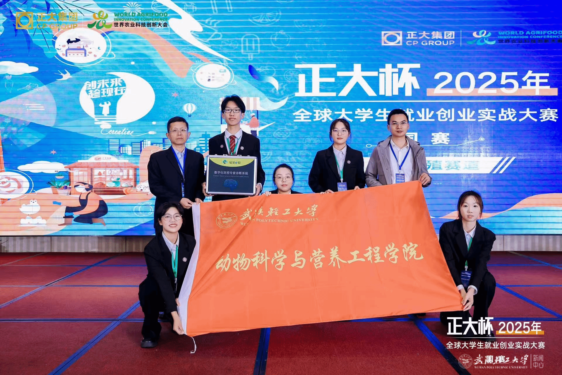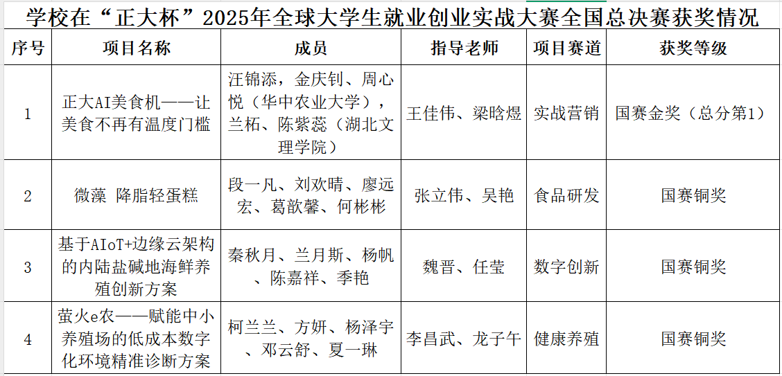 本网讯 11月23日,“正大杯”2025年全球大学生就业创业实战大赛全国总决赛在河南漯河圆满落幕。我校动科学院、食品学院的4个参赛项目分别斩获实战营销赛道、数字创新赛道、食品研发赛道、健康养殖赛道国赛金奖1项、铜奖3项。其中,动科学院的实战营销赛道获奖团队将赴泰国参加国际赛暨研学活动。