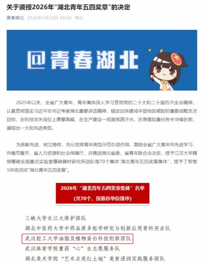 本网讯 近日,湖北省人力资源和社会保障厅、共青团湖北省委、湖北省青年联合会联合印发表彰决定,正式授予全省70个集体“湖北青年五四奖章集体”称号、100名同志“湖北青年五四奖章”称号。我校食品学院油脂及植物蛋白科技创新团队荣获“湖北青年五四奖章集体”,充分展现了我校新时代青年科研工作者扎根专业、矢志创新、服务国家粮食安全战略与民生健康需求的青春担当与卓越风采。