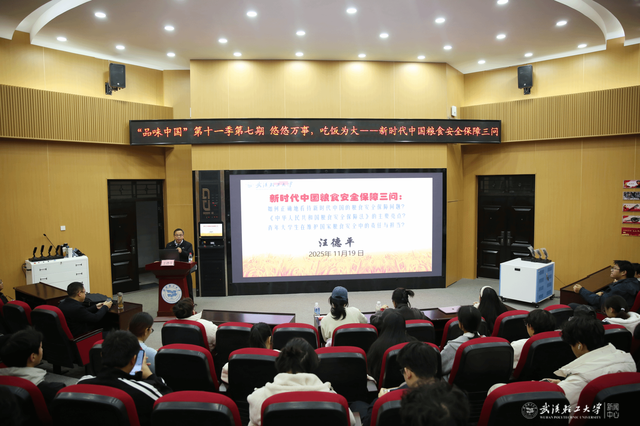 本网讯 为深入贯彻国家粮食安全战略,提升青年学子粮食安全意识,11月19日晚,马克思主义学院汪德平教授做客“品味中国”第十一季第七讲,以“悠悠万事,吃饭为大——新时代中国粮食安全保障三问”为题,为200余名师生深度解析中国粮食安全这一核心命题。马克思主义学院党委书记王晓东、副书记潘春波、副教授杨华祥参加讲座,课程负责人唐俊峰主持。