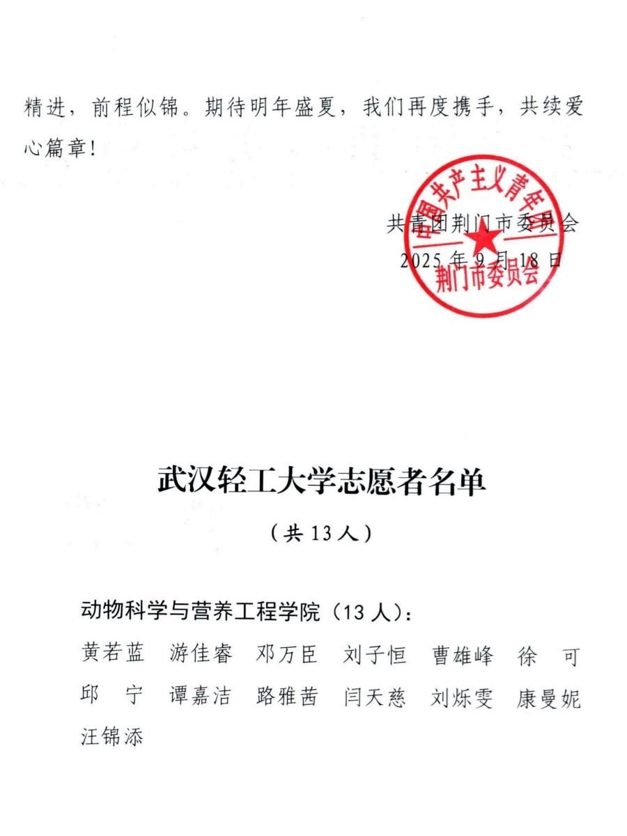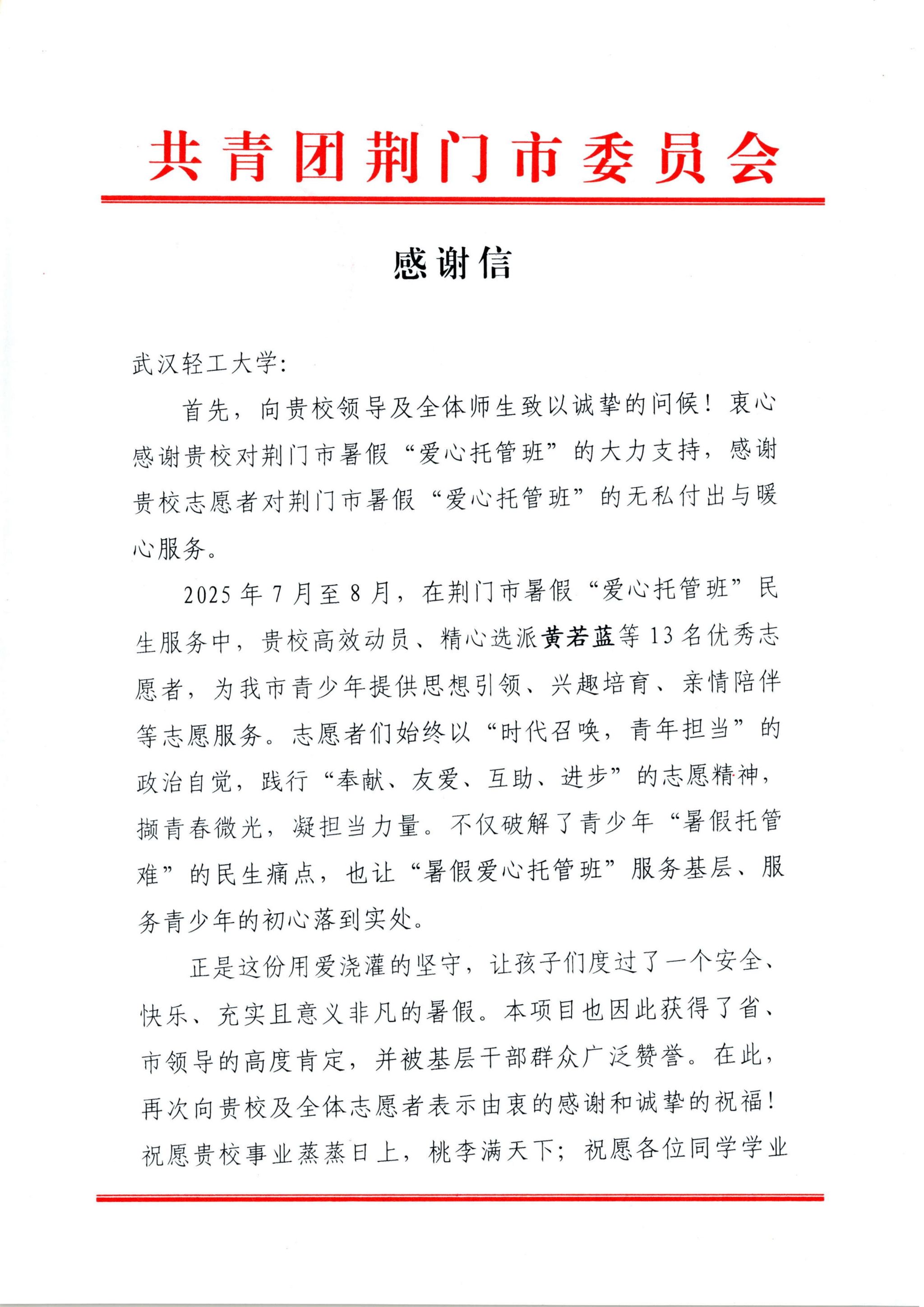 本网讯 近日,共青团荆门市委员会向学校发来感谢信,高度评价我校动科学院对2025年暑假“爱心托管班”项目的全力支持。