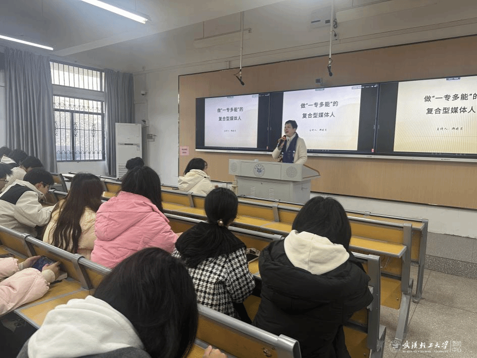 1月6日,系列讲座迎来收官之讲。全国十佳记者、湖北广播电视一级记者郝晋辉以“新时代,怎么成为一个好的媒体人”为主题,为大一新生量身定制成长指南。讲座紧扣“十五五”发展规划与技术变革趋势,他重点强调,新时代媒体人应锚定新质生产力发展需求,以优质内容回应全球对中国创造的关注。他结合AI制作视频实例,提醒学生既要掌控工具属性,更要夯实基本功、坚守原创核心。此外,他还拆解了新时代媒体人须具备的跨界协同、信息甄别、灵活思维三大核心素养,并以全局视角强调协同意识的重要性。