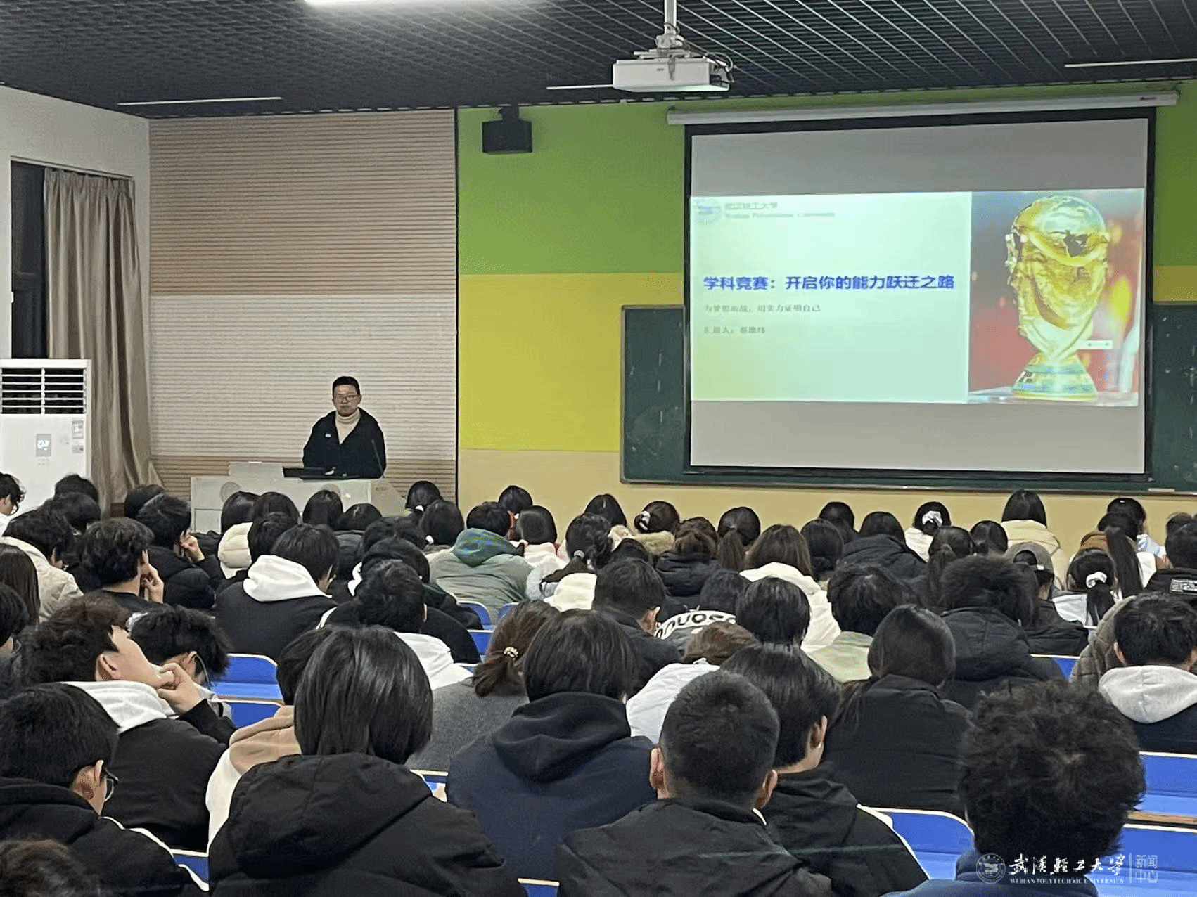 随后,蔡维纬以“学科竞赛:开启你的能力跃迁之路”为主题,结合自身丰富的竞赛指导经验,为新生们带来了干货满满的分享。他从能力飞跃、简历亮点、创新实践、视野拓展四个维度,深入解析了参与学科竞赛的重要意义,强调学科竞赛是将课堂理论转化为实践能力的重要载体,更是求职深造路上的“加分项”。他详细介绍了与软件工程专业紧密相关的学科竞赛类别,包括算法与数据结构类、网络安全类及软件开发与创新类。结合专本衔接班学子在中国大学生计算机设计大赛、全国大学生软件创新大赛、“中国软件杯”等赛事中斩获多项大奖的案例,他为新生们梳理了“基础夯实—专项突破—正式参赛”的三阶备赛路径,建议新生从精通编程语言、系统学习算法与数据结构入手,通过每日刷题、组队磨合、模拟演练等方式积累实战经验。同时,他介绍了我校数计学院为竞赛选手提供的全方位支持体系,包括“教授+企业专家+往届获奖学长”组成的导师团队、寒暑假集训营、7x24小时开放的实验室资源,以及竞赛专项基金、学分认定等激励政策,让新生们对参与学科竞赛充满期待。