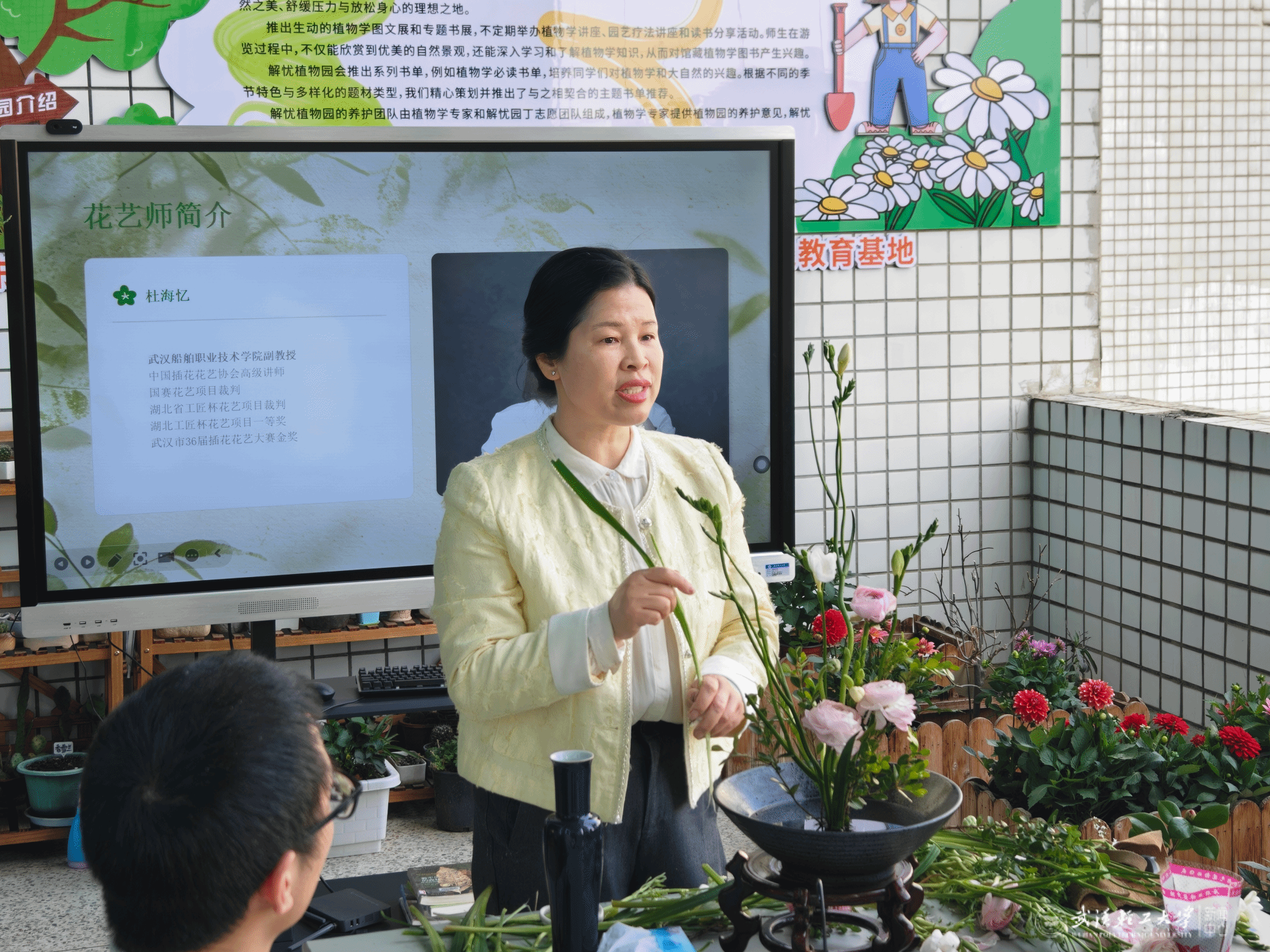 活动伊始,一段清新雅致的AI视频《中式插花的千年雅趣》正式拉开帷幕,带领在场师生回溯中式插花的悠久历史,领略传统花艺的独特美学底蕴,为活动奠定了雅致治愈的基调。随后,中国插花协会高级讲师杜海忆亲临现场,为师生系统讲解中式插花的基本技巧与构图原则,并通过现场演示,详细拆解花材选取、色彩搭配与造型设计的核心要点。“中式插花讲究‘虽由人作,宛自天开’,追求线条的灵动与意境的深远,希望大家在创作中不仅能学到技法,更能体会与自然对话的宁静。”她分享道。