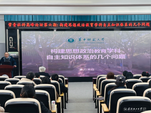 本网讯 在习近平总书记发表“3·18”重要讲话七周年与“5·17”重要讲话十周年之际,3月19日下午,常青社科高峰论坛第六期在积学楼209会议室举行。本次论坛特邀华中师范大学马克思主义学院思想政治教育研究所所长万美容教授,作题为《构建思想政治教育学科自主知识体系的几个问题》的专题报告。马克思主义学院党委书记王晓东、全体教师及研究生参加讲座。讲座由学院院长胡沫主持。