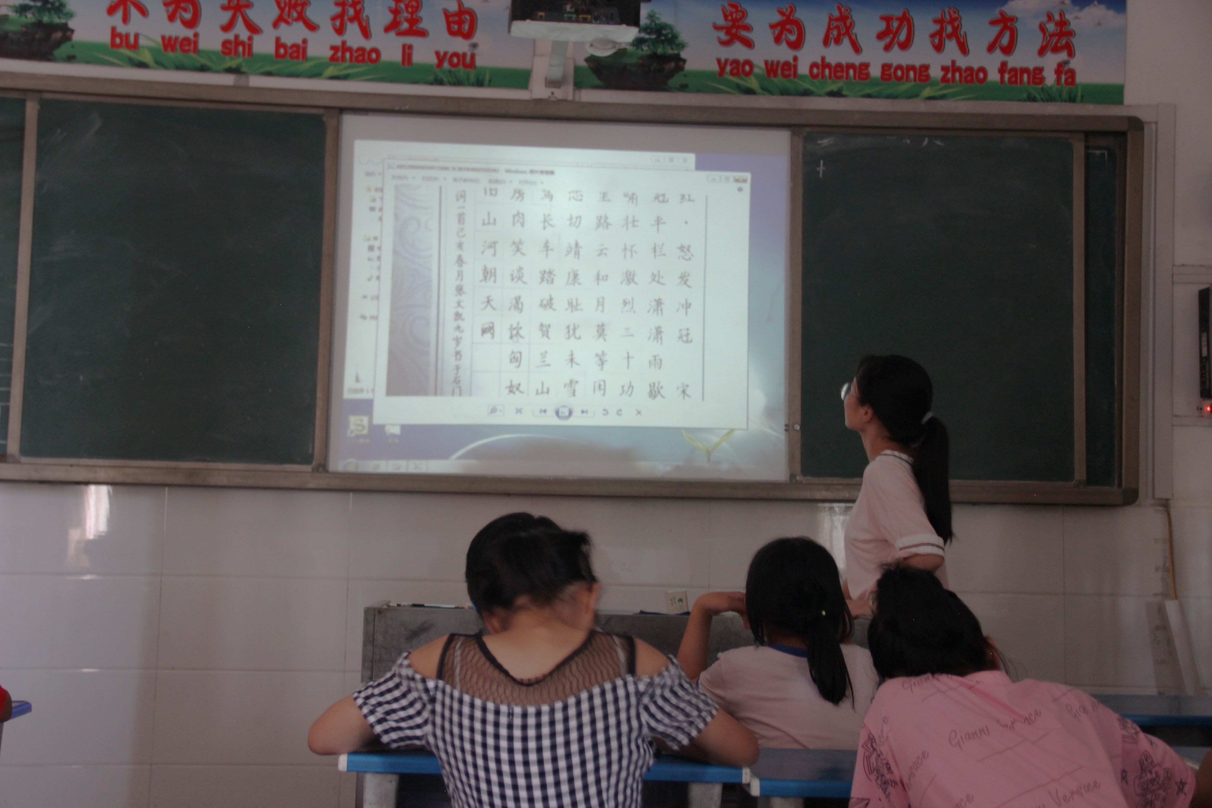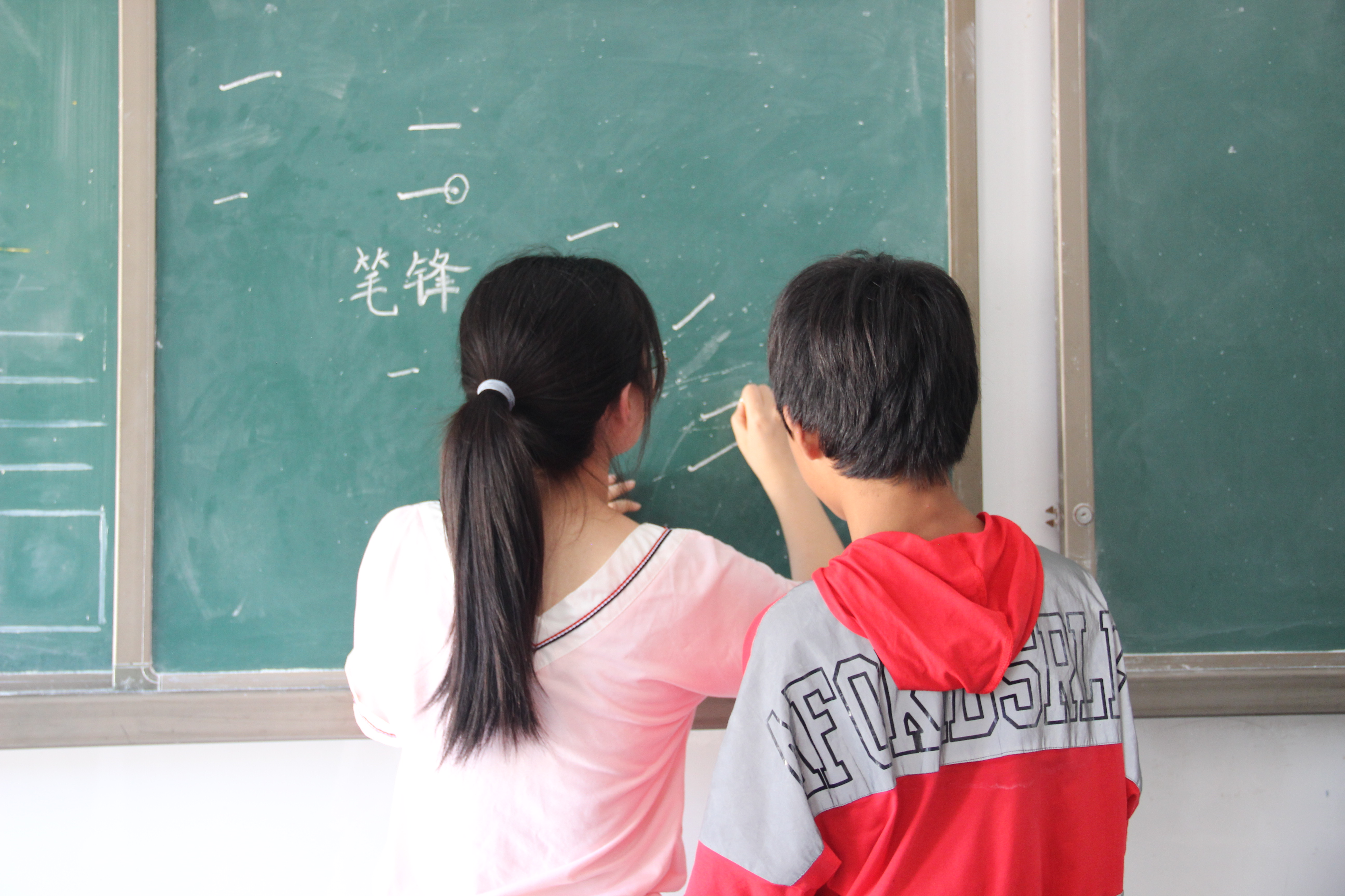 图为团队成员在黑板上为同学纠正笔画写法。中国青年网通讯员 刘琦 摄