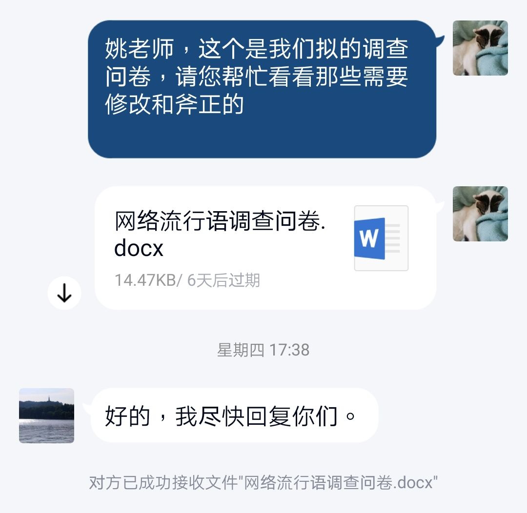 在对调查问卷进行反复的斟酌和考虑后,大中小学生中的流行语调研小分队于7月15日至7月25日进行了为期十日的线上与线下的问卷发放。为响应国家对疫情防控的要求,小分队成员决定在自己的小区进行线下的问卷发放,成员们不惧酷暑,积极走访,将问卷发放至小区中符合问卷年龄段的人群。在小分队成员走访自己小区期间,遇到了很多热情的人们,他们看到小分队成员由于炎热,满头大汗,主动邀请小分队成员来到他们的家中乘凉,还让自己的孩子、亲戚等帮忙填写调查问卷。小分队成员也给予他们一些像糖果、水这样的小礼物来对这些热情无私的人们表示感谢。在线上发放调查问卷期间,团队中的所有成员都积极地将问卷转发至自己的网络社交平台——QQ空间、微信朋友圈等,并进行了大力的宣传。可在问卷发放后的第三天,有效问卷回收数量却没有达到小分队成员的预期。为使问卷结果更具普遍性,成员们进行了积极的讨论,决定加大宣传力度,不仅将问卷发放在QQ空间、朋友圈,还转发至自己的班级群、家族群等并同时加大线下发放问卷的力度。在问卷发放后的第五天,有效问卷回收数量有了明显的提升。