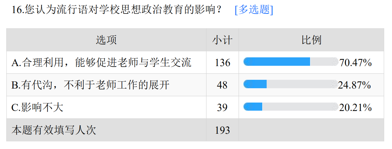 网络流行用语已充分进入了学生的学习与生活中,如下图显示,70.47%的学生认为合理利用网络流行语,能够促进老师与学生的交流。教师可以合理适当地在教学过程中运用一些网络流行语以提高教学的互动和效果。