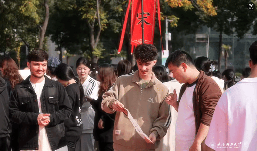 这股跨越时空的文化魅力,也深深吸引了国际学生的热情参与。他们身着汉服,在“大宋朋友圈”背景墙前打卡,努力用中文吟诵着苏轼、李清照的词句。“我从诗里学到了很多很好的词语。”国际学生兰华用流利的中文分享感受。来自摩洛哥的范月希则对仪式中的庄重感印象深刻:“我真的很喜欢中国人庆祝仪式的方式,尊重且庄重。”