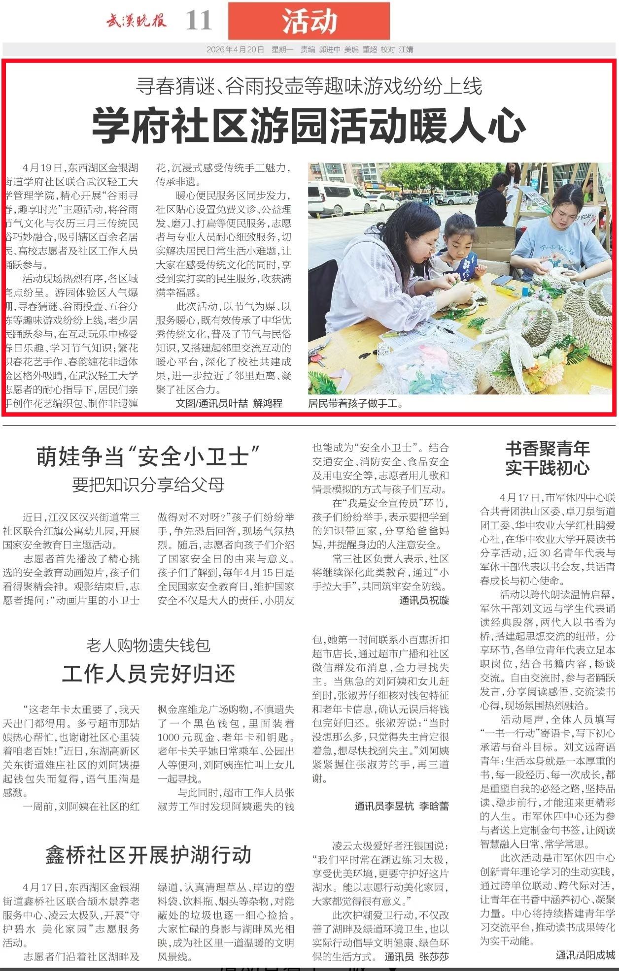 本网讯 4月19日,东西湖区金银湖街道学府社区联合武汉轻工大学管理学院,精心开展“谷雨寻春,趣享时光”主题活动,将谷雨节气文化与农历三月三传统民俗巧妙融合,吸引辖区百余名居民、高校志愿者及社区工作人员踊跃参与。
